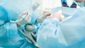 Close up dental surgery process – Implantation. Dentist surgeon with assistant in modern clinic. Stomatology and health care concept. selective focus. Space for text